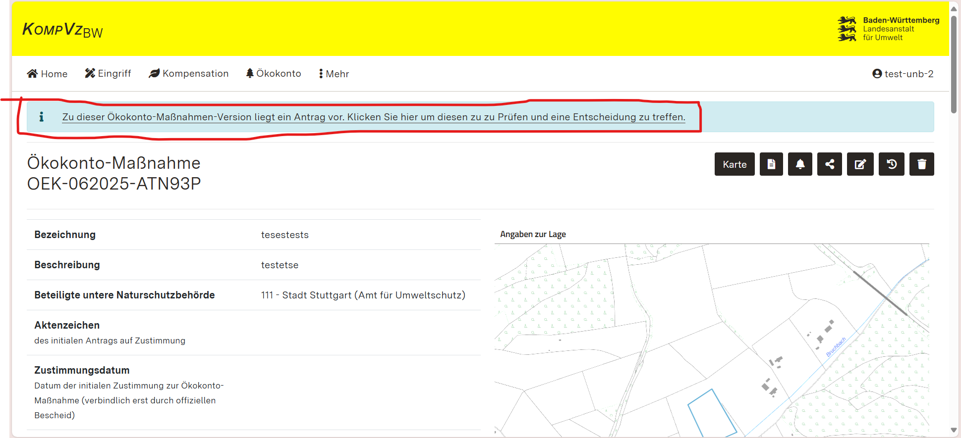 Das Vorliegen eines eingereichten Antrags wird durch einen Hinweis in der Detailansicht einer Ökokonto-Maßnahme angezeigt. Klicken Sie den unterstrichenen Text des Hinweises an, um mit der Prüfung des Antrags zu beginnen.