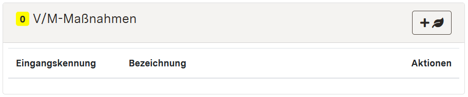 Um Angaben zu Vermeidungs- und Minimierungsmaßnahmen zu ergänzen, gehen Sie zu den Detaildaten "V/M-Maßnahmen" nach unten. Klicken Sie auf [Neue V/M-Maßnahme hinzufügen] am oberen rechten Rand der Detaildaten "V/M-Maßnahmen" ([+]-Button).
