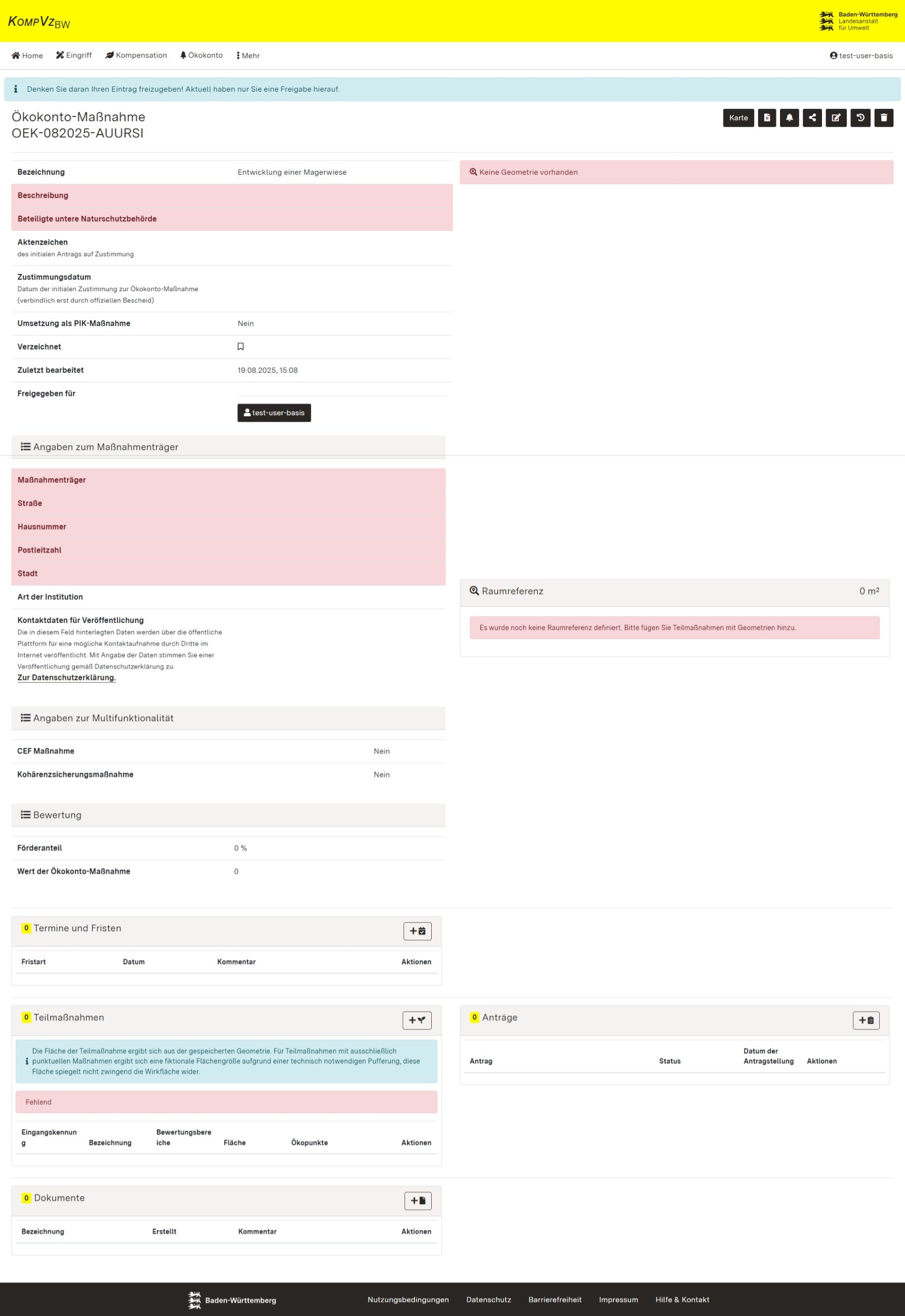 In der Detailansicht werden Ihnen alle bereits vorgenommenen Eintragungen der Ökokonto-Maßnahme angezeigt. Rot hinterlegt sind die fehlenden Eintragungsfelder, die zur Antragstellung der Ökokonto-Maßnahme zwingend erforderlich sind.