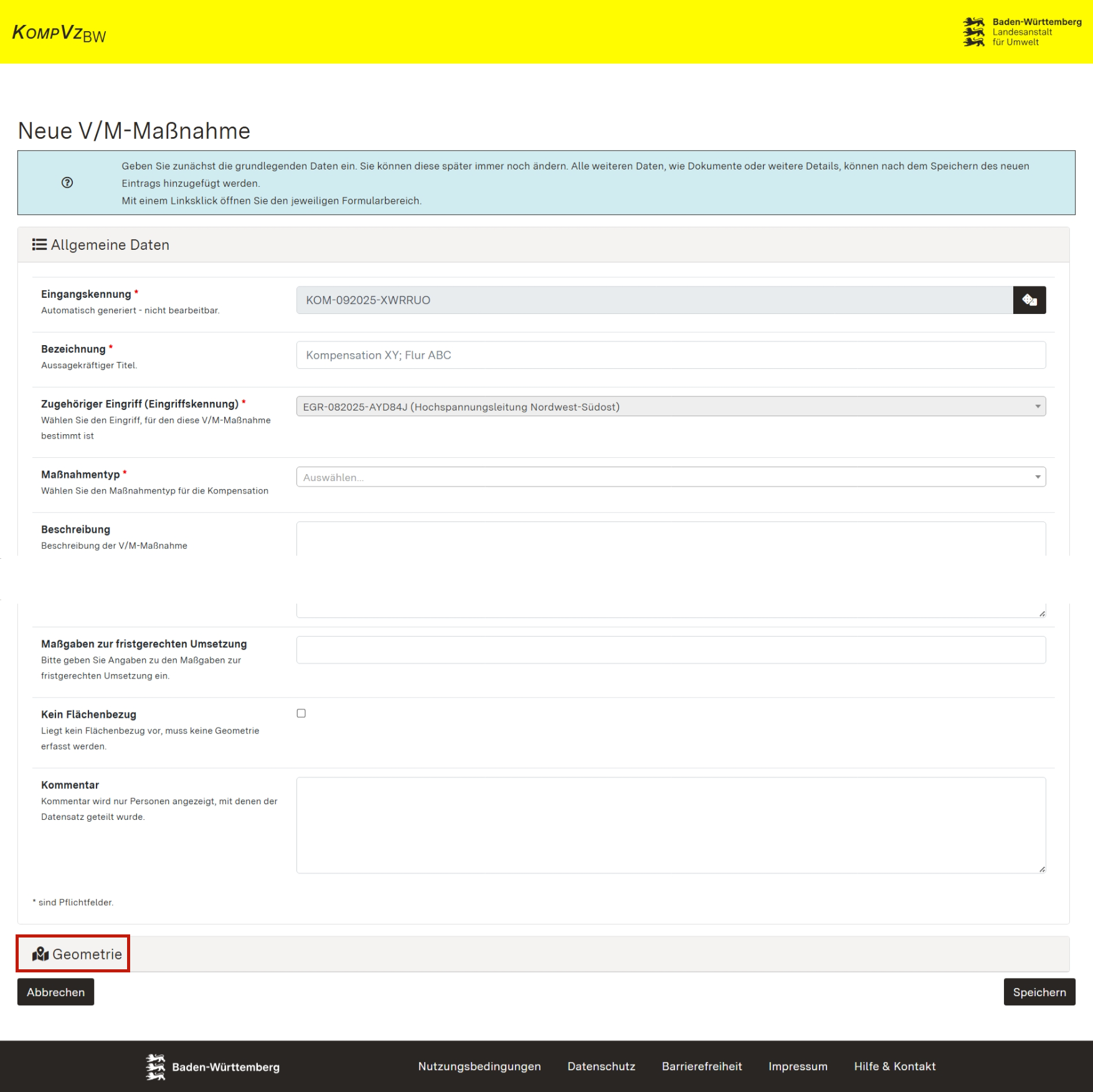 Screenshot des Formulars zum Erfassen der Allgemeinen Daten sowie der Geometrie einer Vermeidungs- und Minimierungsmaßnahme