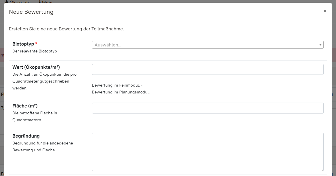 Über den [+]-Button beim Ausgangszustand öffnet sich ein Dialogfenster über das eine neue Bewertung des Ausgangszustandes der Maßnahmenfläche hinzugefügt werden. Für die Berechnung in Ökopunkten müssen der Biotoptyp, der jeweilige Wert in Ökopunkten pro Quadratmeter und die Fläche der Maßnahme angegeben werden. Darüber hinaus kann zum Ausgangszustand noch eine Begründung ergänzt werden. Diese ist insbesondere bei Abweichungen vom Normalwert auszufüllen.