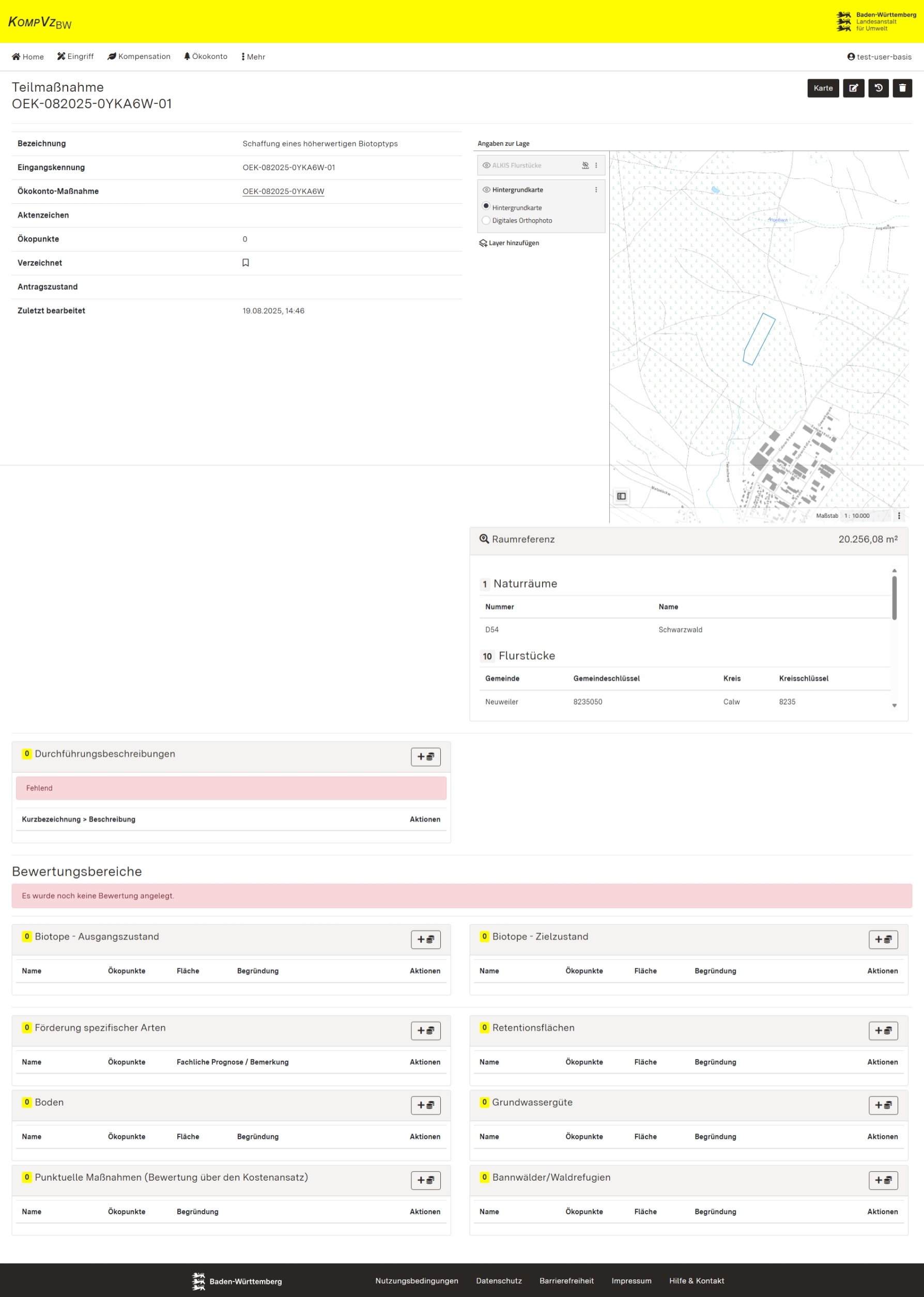 Wenn Sie eine neue Teilmaßnahme angelegt haben, gelangen Sie auf die Detailansicht der Teilmaßnahme. Die Teilmaßnahme können Sie auch jederzeit über die Detaildaten der zugehörigen Ökokonto-Maßnahme aufrufen.