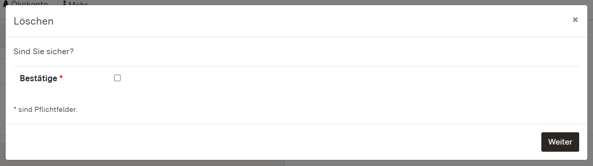 Bei Auswahl des [Mülleimer]-Buttons zum Löschen öffnet sich ebenfalls ein Dialogfenster. In diesem Fall jedoch zur Bestätigung der Löschung. Nur bei Setzen des Häkchens und anschließendem Klick auf [Weiter] wird das hinterlegte Datum gelöscht.