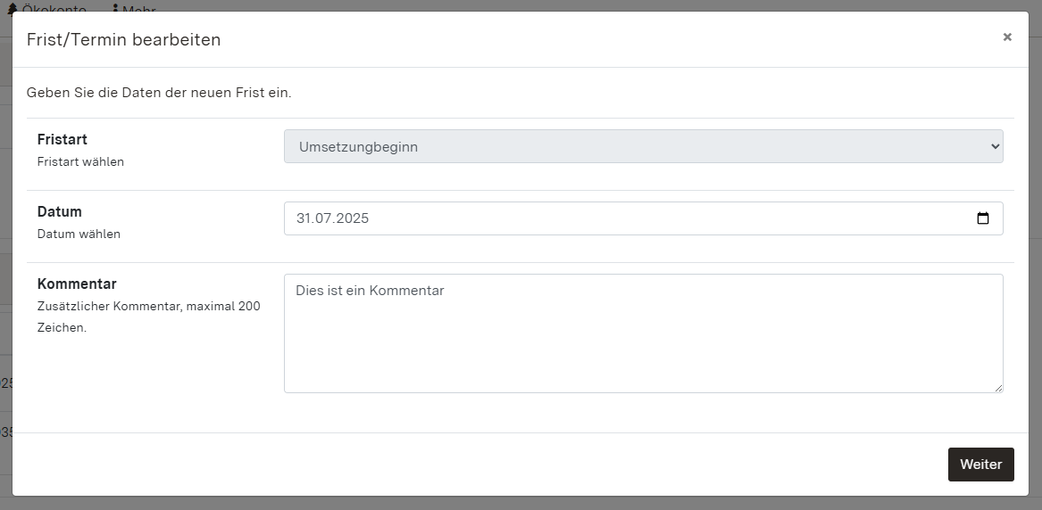 Bei Auswahl des [Stift]-Buttons zum Bearbeiten öffnet sich ein Dialogfenster, in dem das Datum sowie der dazugehörige Kommentar bearbeitet werden können. Die Fristart kann jedoch nicht geändert werden. Anschließend wird mit einem Klick auf [Weiter] die bearbeitete Angabe hinterlegt.