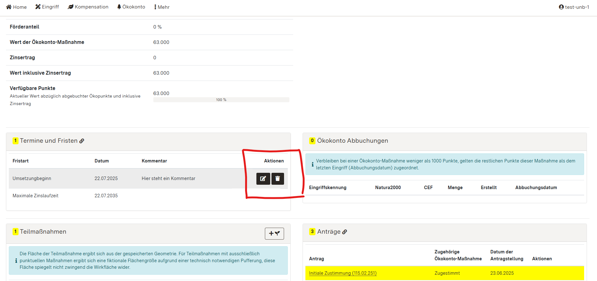 Alternativtext: Screenshot der Ökokonto-Maßnahmen-Übersichtsseite mit Markierung des Reiters "Termine und Fristen"